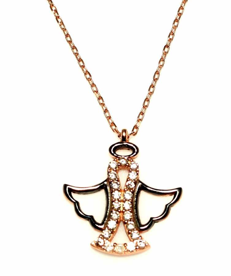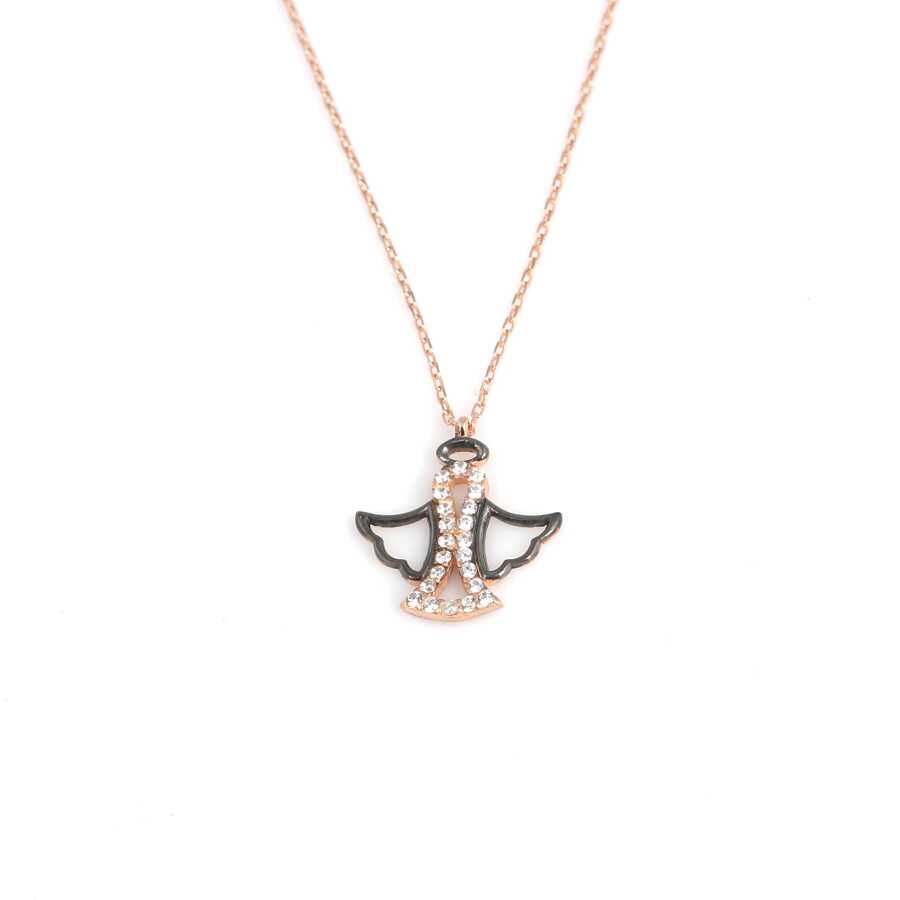 925 Ayar Gümüş Melek Modeli Kolye, Pembe Siyah - Beyaz Taş