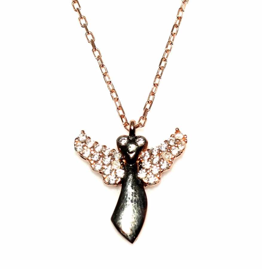 Gümüş kolye 925 ayar gümüşten yapılmıştır. Melek kolye 1,3 cm'ye 1,4 cm boyutlarındadır. Zinciri 41 cm uzunluğundadır. Kolyenin taşları zirkondur. Rose renklidir. Ağırlığı 1,66 gramdır.