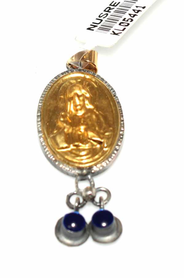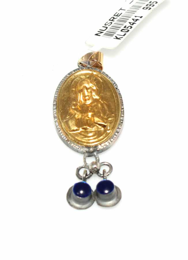 925 ayar gümüş ve 24 ayar altının bir arada kullanılmasıyla hazırlanan kolye ucudur. Meryem Ana figürü şeklindeki kolye ucu 4,0 cm'ye 1,5 cm boyutlarındadır. Zincirin dahil olmadığını lütfen unutmayın. Kolye ucu 0,94 gramdır.