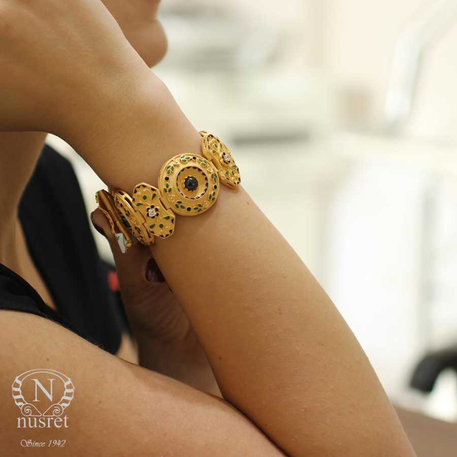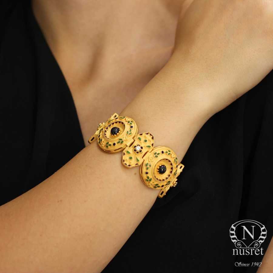 22 ayar altın Bileklik boyu: 21,50 cm Eni: 3,10 cm Paftalı mineli ufo bileklik renkli minelidir. kilitlidir. Taşları beyaz siyah safir ve zirkondur. Gramı: 113,34