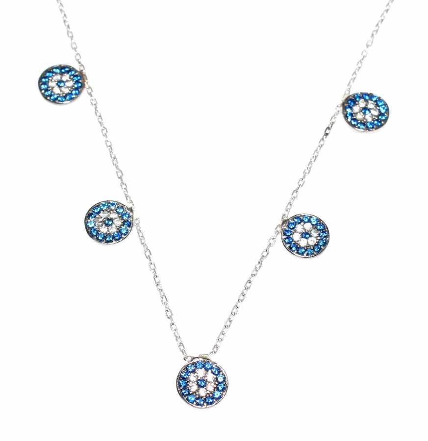 Gümüş kolye 925 ayar gümüşten yapılmıştır. 5 adet nazar boncuğu figüründen oluşan ince gerdanlık kolye 45 cm uzunluğundadır. Kolye ucundaki nazar boncuğu 0,7 cm boyutlarındadır. Kolye zirkon taşlıdır. Ağırlığı 2,6 gramdır.