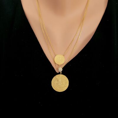 22 ayar altındır. Büyüklü küçüklü paralardan oluşan kolyedir. Zincir uzunluğu 45 cm. kolye ucunda 6,3 x 2,8 cm. Paraların arasında yuvarlak taşlı parça vardır. Gramı: 16,63 gr.