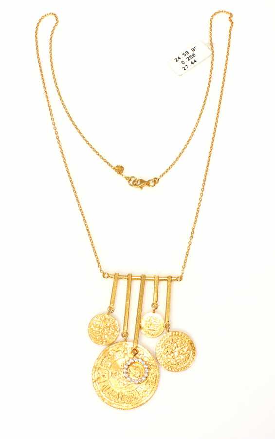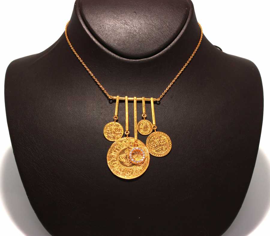 Altın kolye 22 ayar altından üretilmiştir. Osmanlı tuğralı model kolye 6 cm'ye 3,5 cm boyutlarındadır. Altın kolye 52,5 cm uzunluğundadır. Kolye signyt zirkon taşlıdır. Ağırlığı 24,59 gramdır. Verilen gramlar yaklaşıktır, değişebilir.