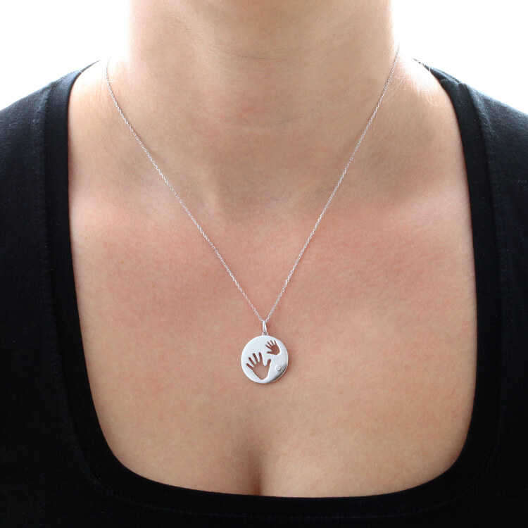 Anne ve Çocuk El figürü model kolye 14 ayar altın madeninden üretilmiştir. Kolye üzerinde 1 adet 0,02 karat ağırlığında G renk VS berraklığında pırlanta taş mevcuttur Kolye zinciri 42 cm uzunluğundadır. Kolye 3,2 gram ağırlığındadır.