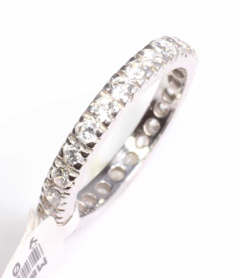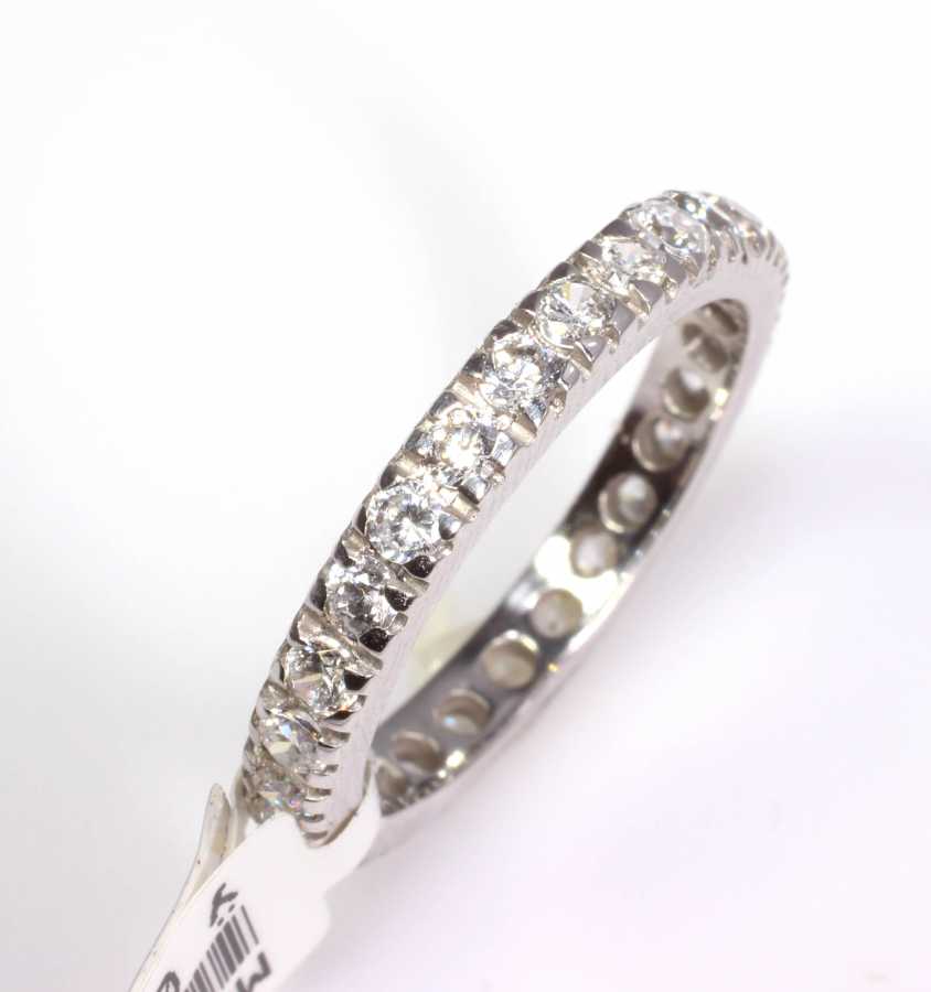 Tamtur yüzük 18 ayar altın madeninden üretilmiştir. Yüzük üzerinde 26 adet 0,55 karat ağırlığında G renk VS berraklığında beyaz pırlanta taş mevcuttur. Tam tur yüzük 4,9 gram ağırlığındadır. Sertifika için bizimle iletişime geçebilirsiniz.