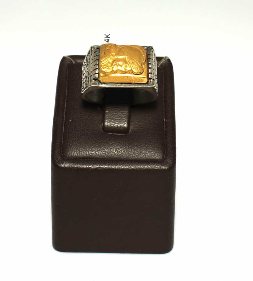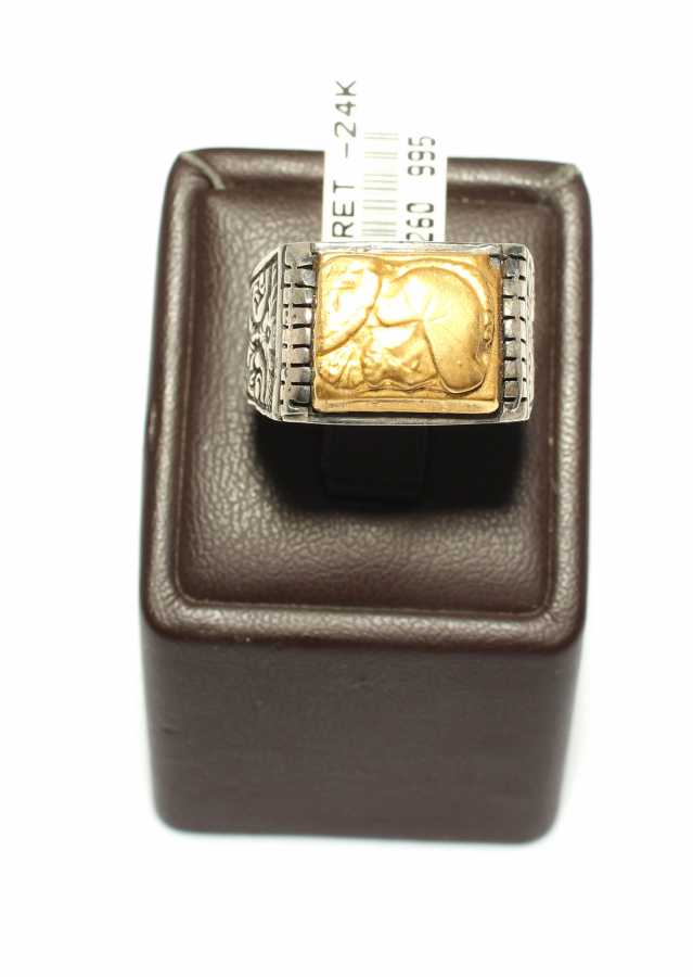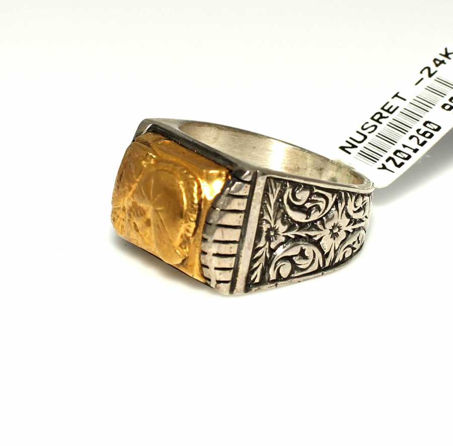 24 ayar altın ve 925 ayar gümüş yüzük ölçüsü: 20,50 x 1,4 cm`dir. Gümüş yüzük, altın resimlidir. Gramı: 0,81