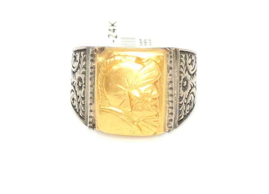 24 ayar altın ve 925 ayar gümüş yüzük ölçüsü: 20 x 1,4 cm`dir. Gümüş yüzük, altın resimlidir. Gramı: 0,89