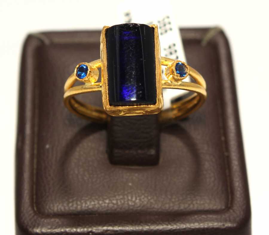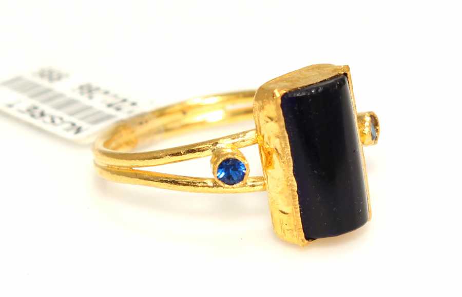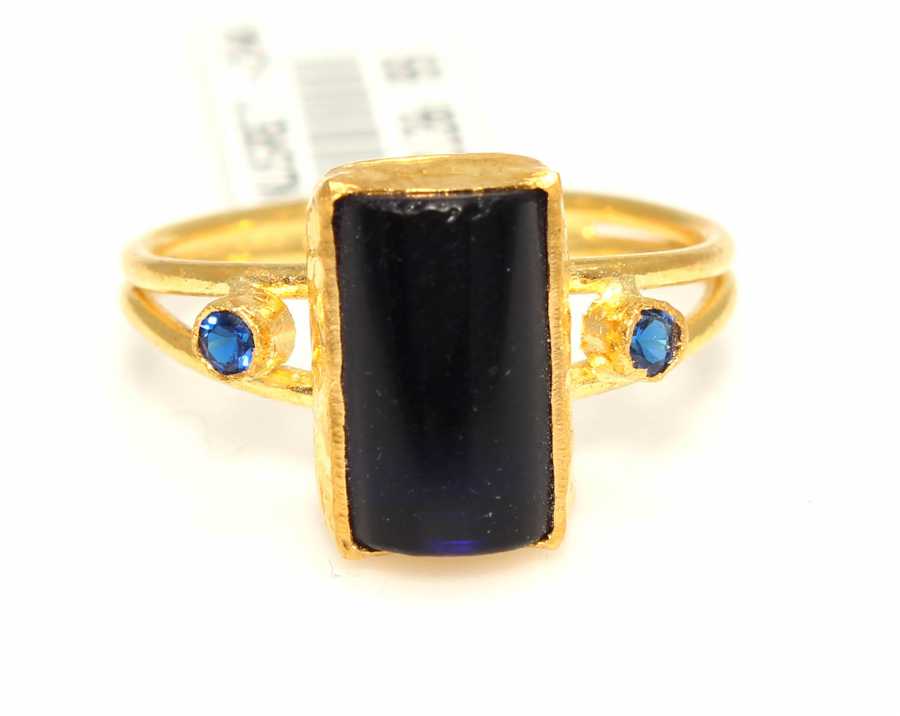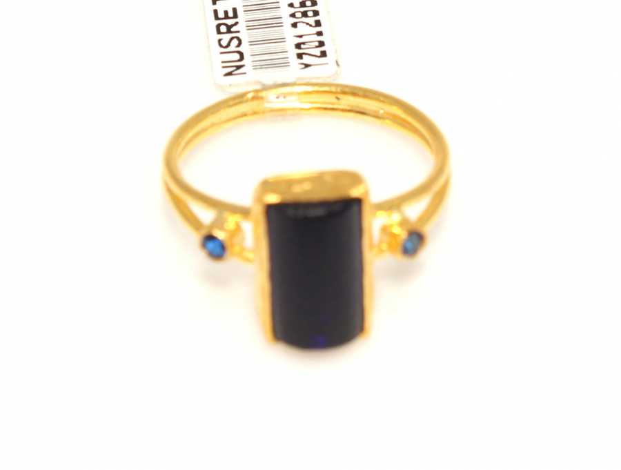 Yüzük 24 ayar altından üretilmiştir. El işi yüzük 22 ölçüdür. Tüm ölçüler yapılabilmektedir. Yüzüğün üst kısmı 1,3 cm boyutlarındadır. Yüzük safir renk ve zirkon taşlıdır. Ağırlığı 6 gramdır.