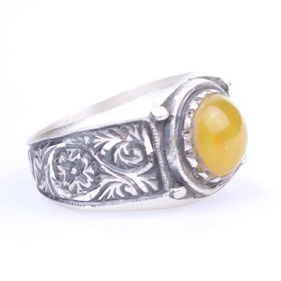 Yüzük 925 ayar gümüşten üretilmiştir. Yüzüğün üzerinde el kalemi atılarak tasarlanmıştır. Taşlı yüzük 1,4 cm'ye 1,4 cm boyutlarındadır. Resimdeki yüzük 23 ölçüdür, ancak tüm ölçüler özel olarak yapılabilmektedir. Yüzük sıkma kehribar taşlıdır. Ağırlığı 10,65 gramdır.