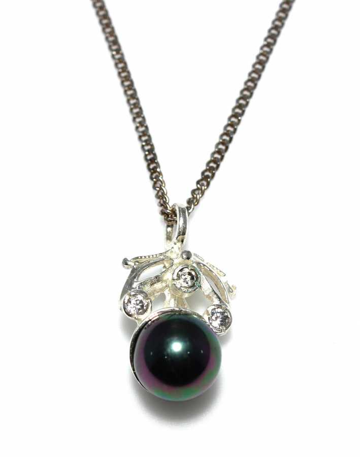 Gümüş kolye 925 ayar gümüşten yapılmıştır. Salkım kolye 1,6 cm'ye 1,1 cm boyutlarındadır. Zinciri 45 cm uzunluğundadır. Kolye zirkon ve siyah inci taşlıdır. Ağırlığı 4,65 gramdır.