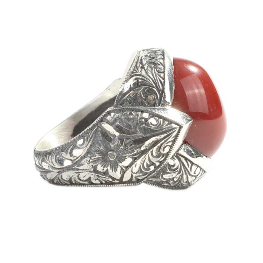 Yüzük 925 ayar gümüşten üretilmiştir. Yüzüğün üzerinde el kalemi atılarak tasarlanmıştır. Resimdeki yüzük 28 ölçüdür, ancak tüm ölçüler özel olarak yapılabilmektedir. Yüzük akik taşlıdır. Ağırlığı 20,77 gramdır.