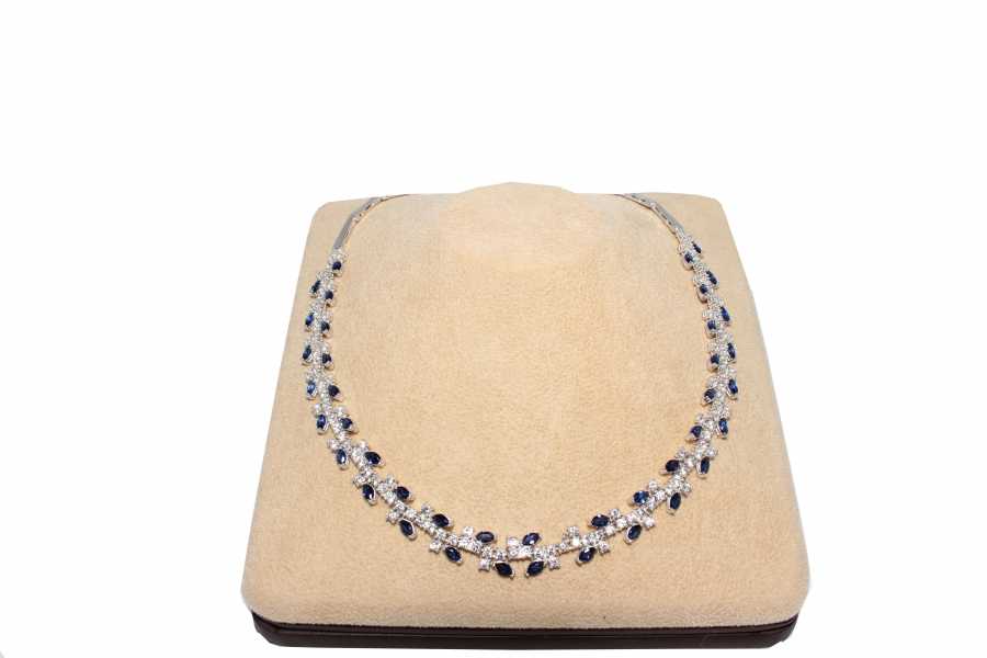 Gümüş kolye 925 ayar gümüşten yapılmıştır. Gümüş fantezi kolye 43 cm uzunluğundadır. yaprak motifli su yolu kolye 1 cm enindedir. Kolye safir renk zirkon ve zirkon taşlıdır. Ağırlığı 31,2 gramdır.
