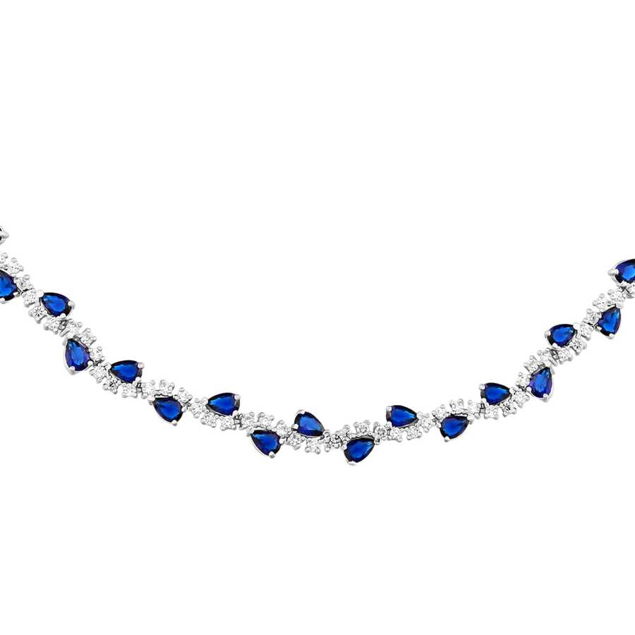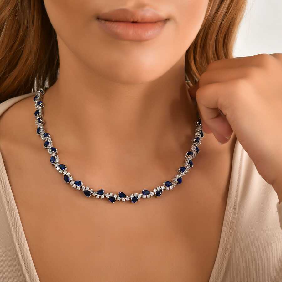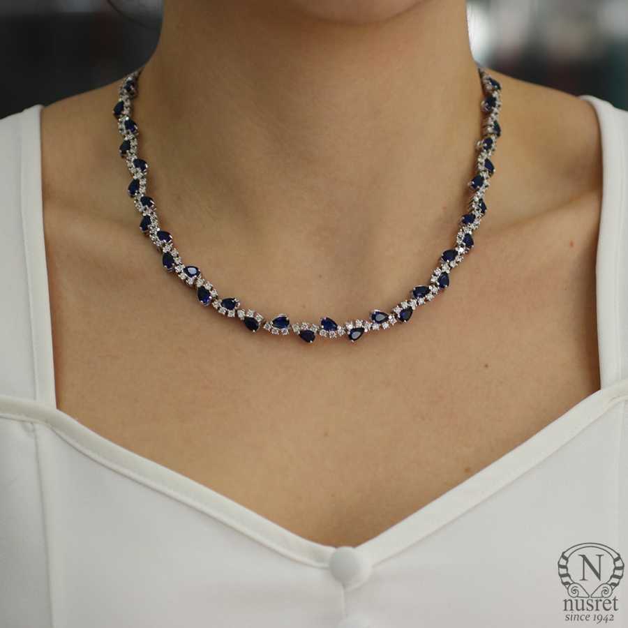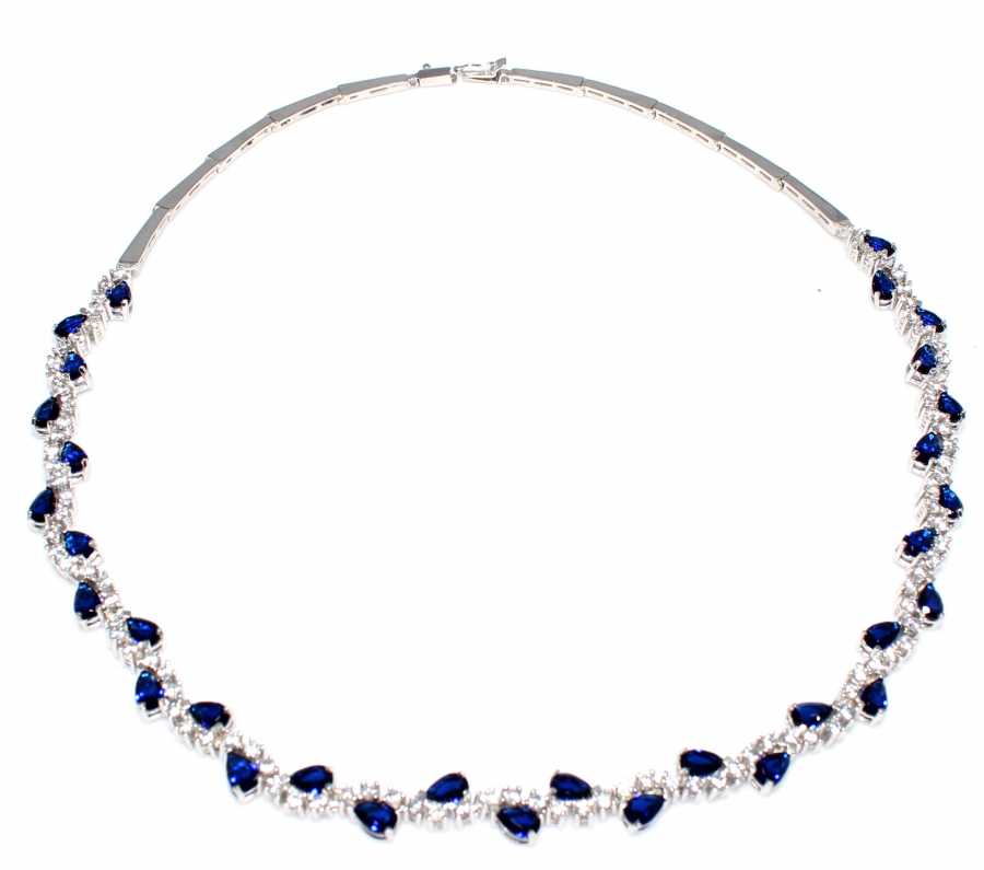 Gümüş kolye 925 ayar gümüşten yapılmıştır. Gümüş fantezi kolye 45 cm uzunluğundadır. Su yolu kolye 0,8cm enindedir. Kolye safir renk zirkon ve zirkon taşlıdır. Ağırlığı 32,3 gramdır.