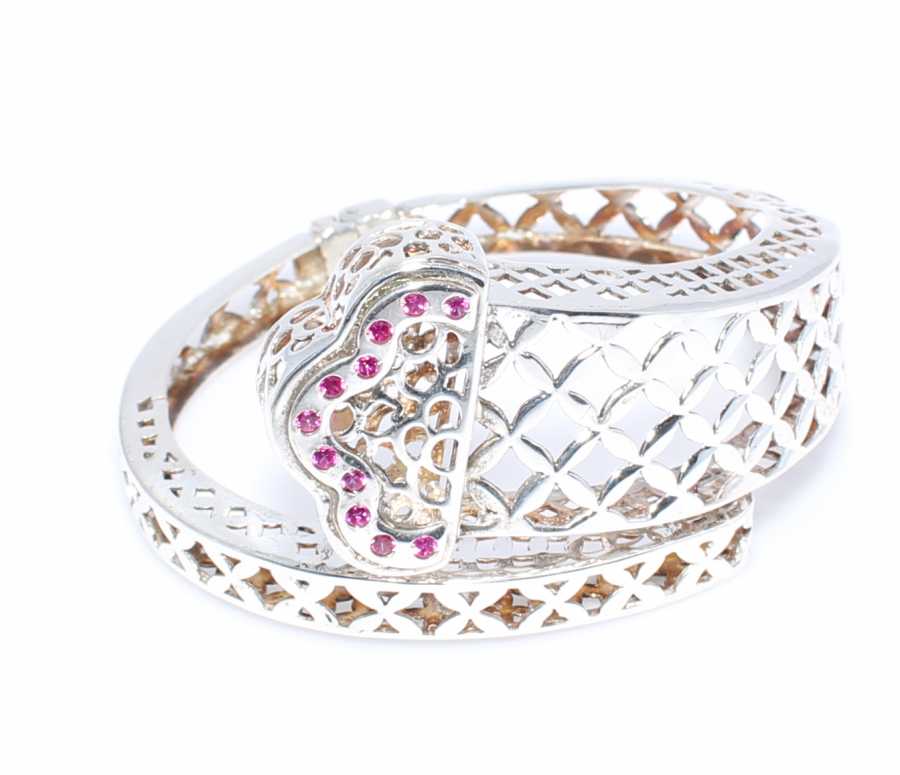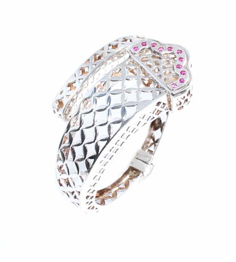 925 ayar gümüş,5,2 cm çaplı, kaşı taşlı ve ajurlu bilezik. Gramı: 18,24