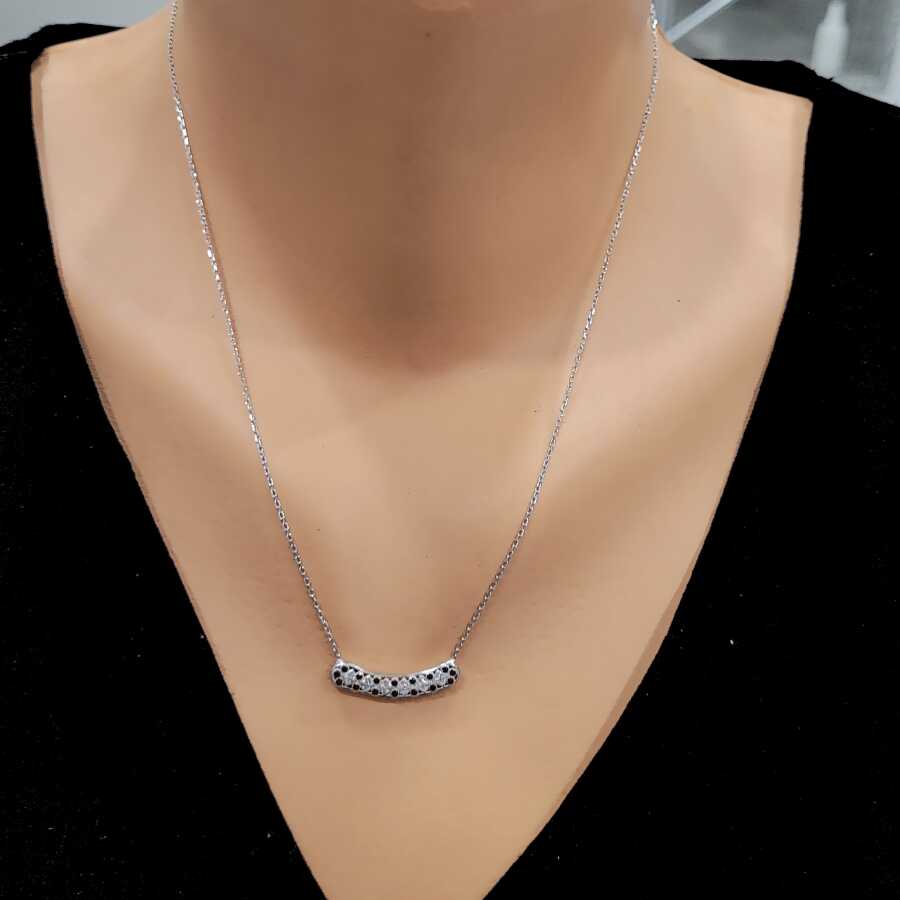 Gümüş kolye 925 ayar gümüşten yapılmıştır. Gümüş kolye 2,4 cm'ye 0,4 cm boyutlarındadır. Zinciri 42 cm uzunluğundadır. Kolye beyaz ve siyah renk zirkon taşlıdır. Ağırlığı 2,35 gramdır.