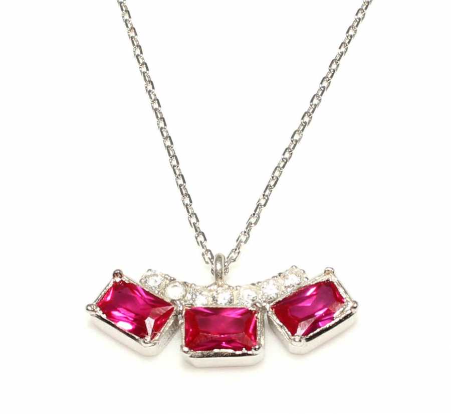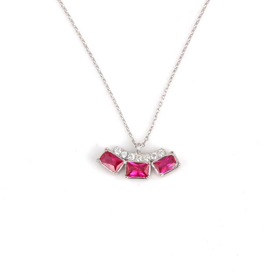 925 Ayar Gümüş 3 Taşlı Kolye, Beyaz - Kırmızı, Beyaz Taş