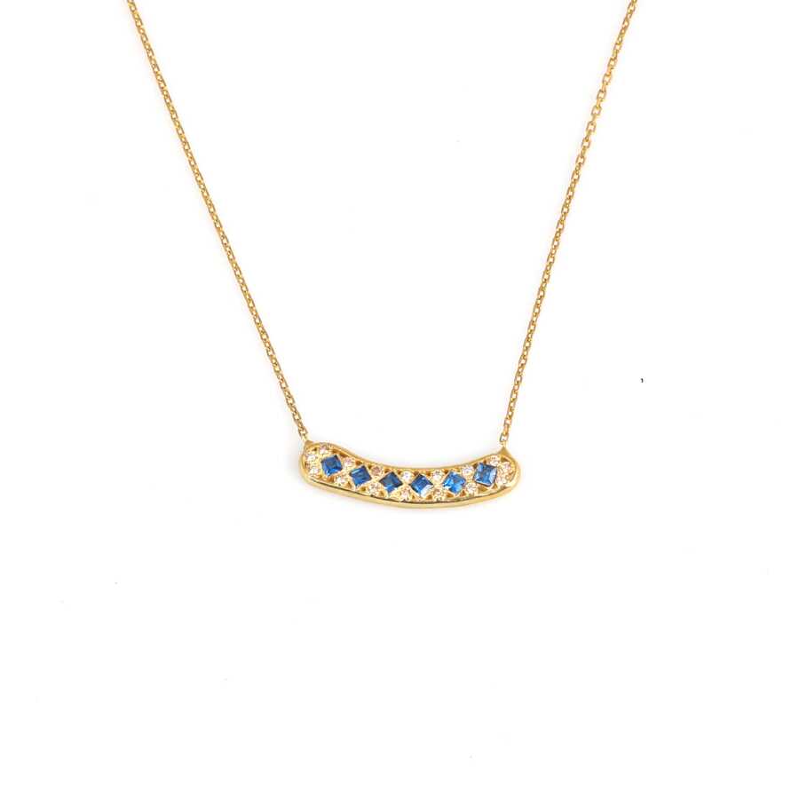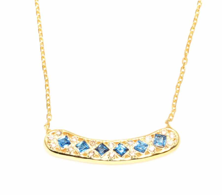 Gümüş kolye 925 ayar gümüşten yapılmıştır. Gümüş kolye 2,4 cm'ye 0,4 cm boyutlarındadır. Zinciri 42 cm uzunluğundadır. Kolye mavi ve beyaz zirkon taşlıdır. Ağırlığı 2,35 gramdır.