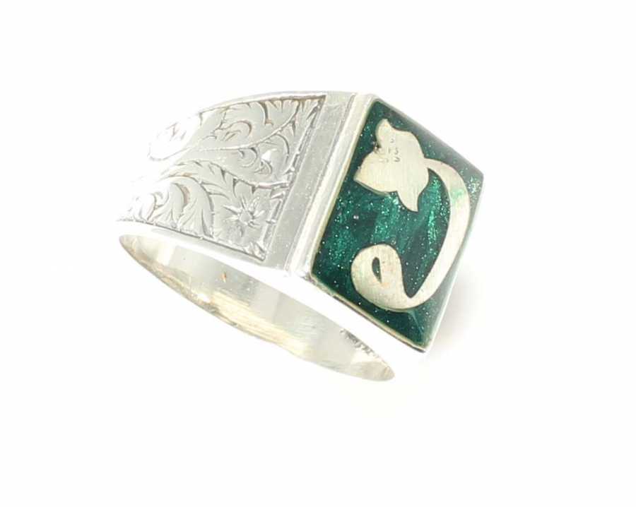 Vav harfi; tevazu, teslimiyet ve maneviyatın sembolüdür. Bu özel tasarım 925 ayar gümüş erkek yüzük, yeşil mineli kare zemin üzerine işlenmiş Vav motifiyle derin bir anlam taşır. Işığa göre hafif parlayan minesi ve güçlü formu sayesinde hem klasik hem modern kombinlerle uyum sağlar. Yan yüzeylerdeki detaylı motif işlemeleri yüzüğe karakter katar ve onu sıradan modellerden ayırır.