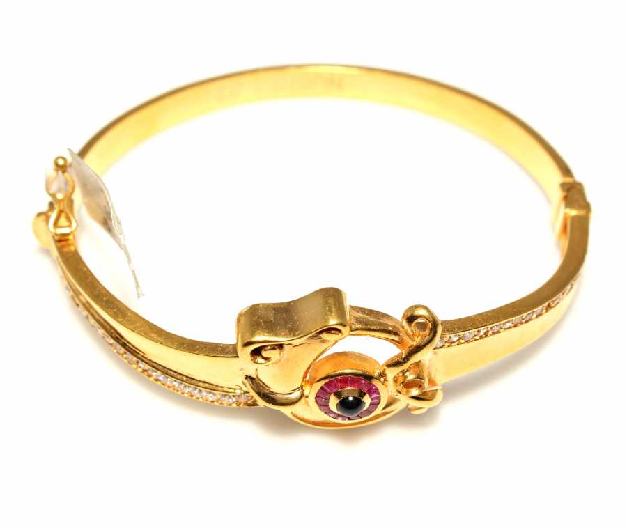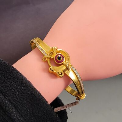 22 ayar altın Bilezik Çapı: 6,0 cm Eni: 2,1 cm Döküm Orta parçaya yakut ve safir taş ve yine Döküm kol kısmına zirkon taş koyularak imal edilmiştir. Kilitlidir. Gramı: 25,33 gr
