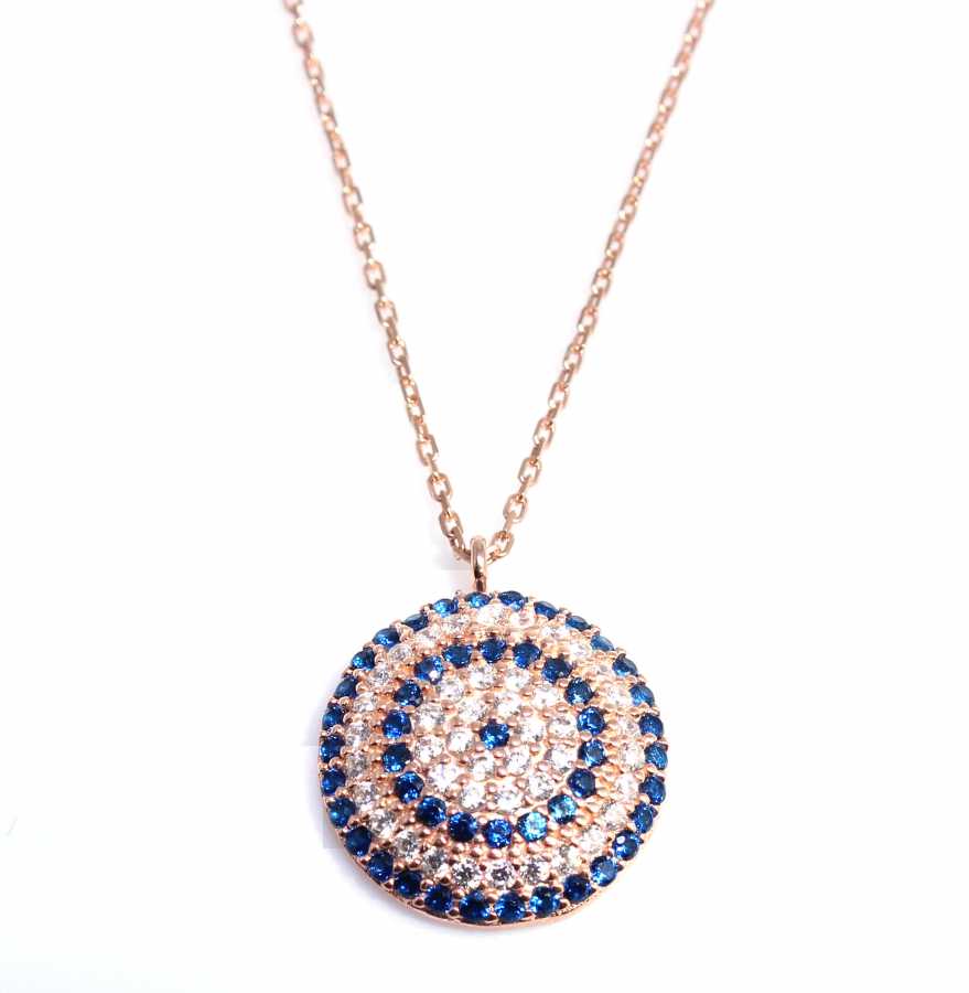 Gümüş kolye 925 ayar gümüşten yapılmıştır. Yuvarlak şeklinde nazar boncuğu kolye 1,5 cm boyutlarındadır. Zinciri 41 cm uzunluğundadır. Kolye zirkon taşlıdır. Rose renklidir. Ağırlığı 2,8 gramdır.