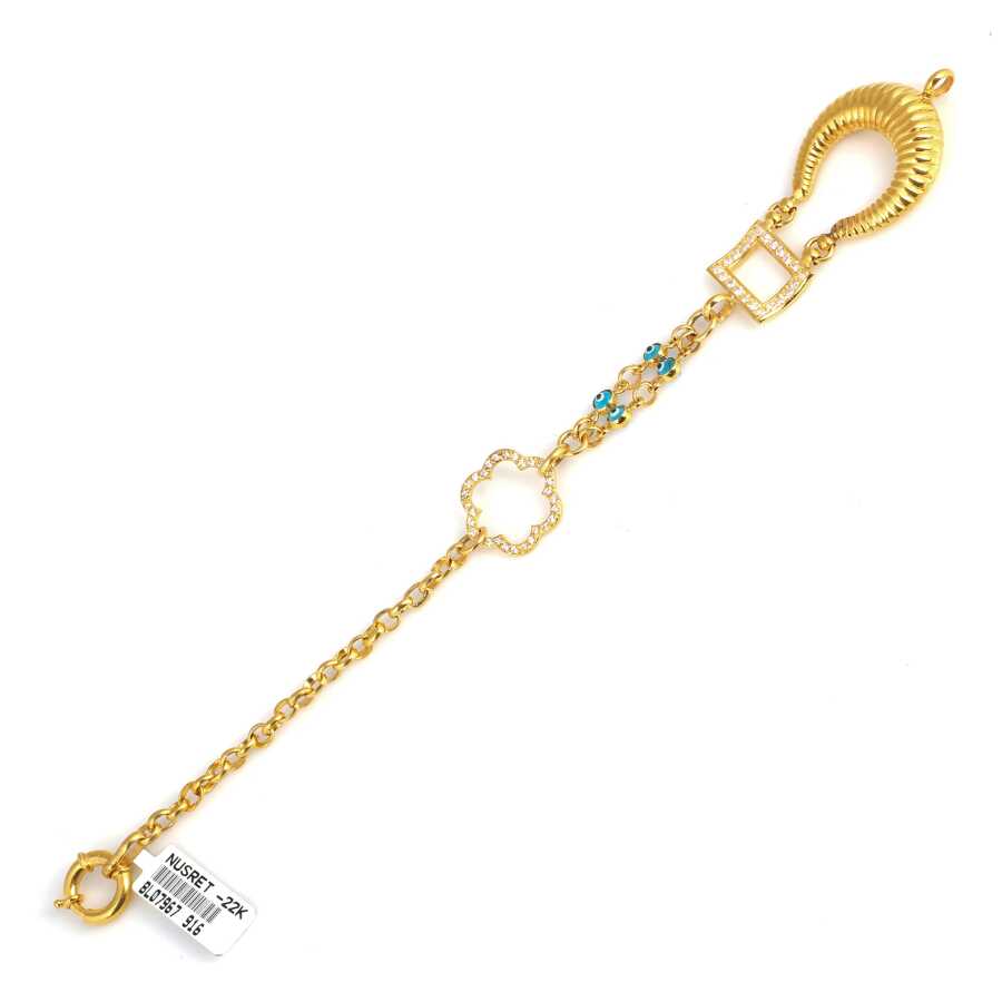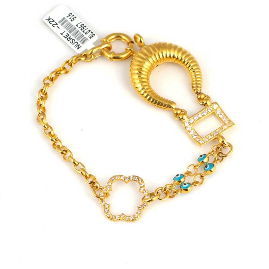 Bileklik 22 ayar altından imal edilmiştir. Göz boncuklu model bileklik 20 cm uzunluğundadır. El işi bileklik 2,5 cm genişliğindedir. Bileklik taşsızdır. El işi bileklik 19,4 gram ağırlığındadır.
